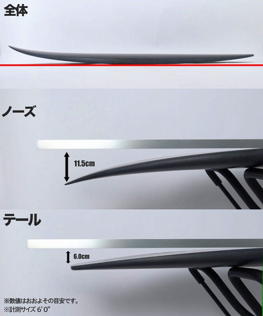 全体的にレールボリュームはありますが、ノーズエリアは丸くまろやかな形状によりターンへの導入がし易く、センター付近では十分なボリュームがることで波からの反発によりスピードが得られます。テールに向かうにつれテーパードされ薄くなっていき、テール付近ではエッジ+テールエリア全体を薄く仕上げていることで反応が良く、このミッドサイズのボードにおいてもパフォーマンス性を体感することができます。