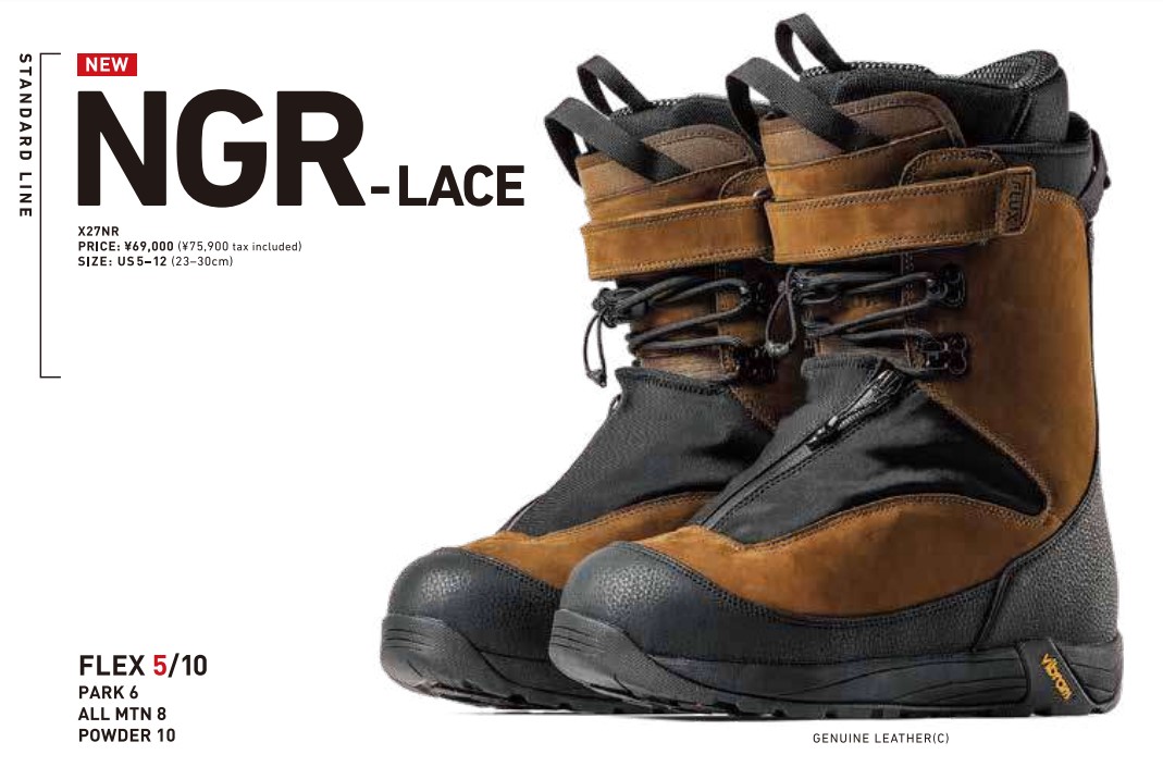 FLUXの中井孝治モデルバインディング「NGR」と組み合わせることで、さらに高いグリップ力を発揮。ブーツNGRと合わせた際に最適な高さになるよう、フットベッドはあえてフラットかつ低めに設計されている。