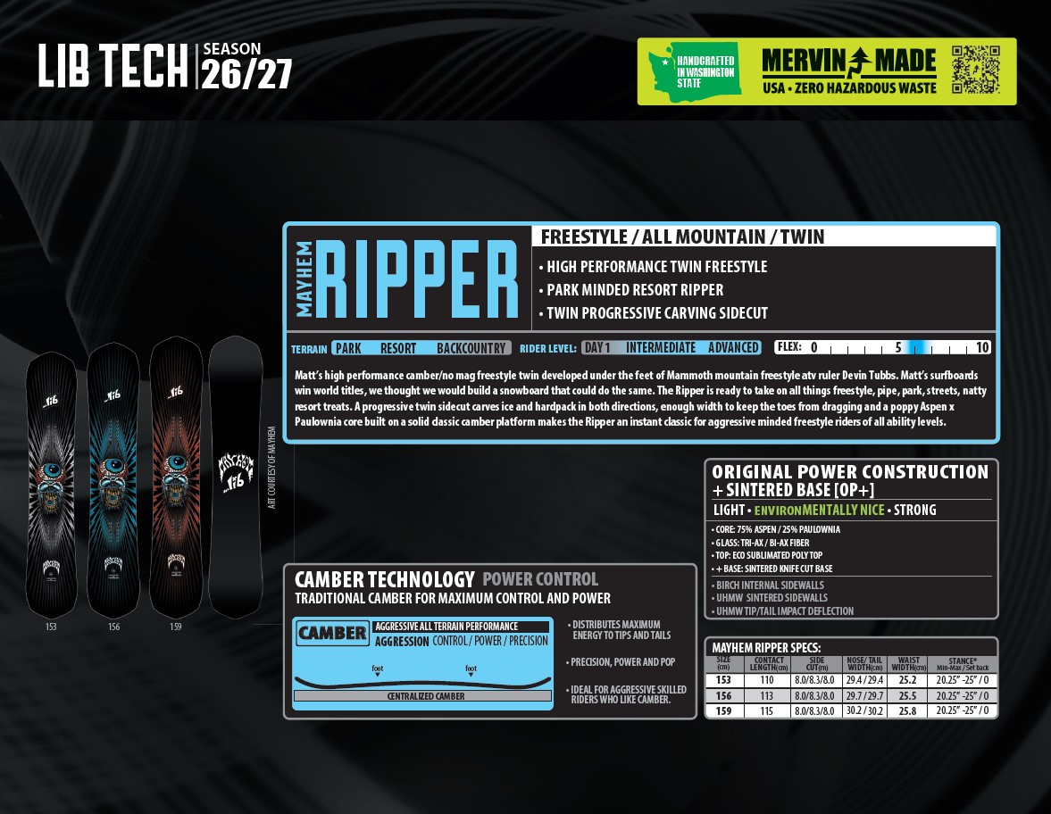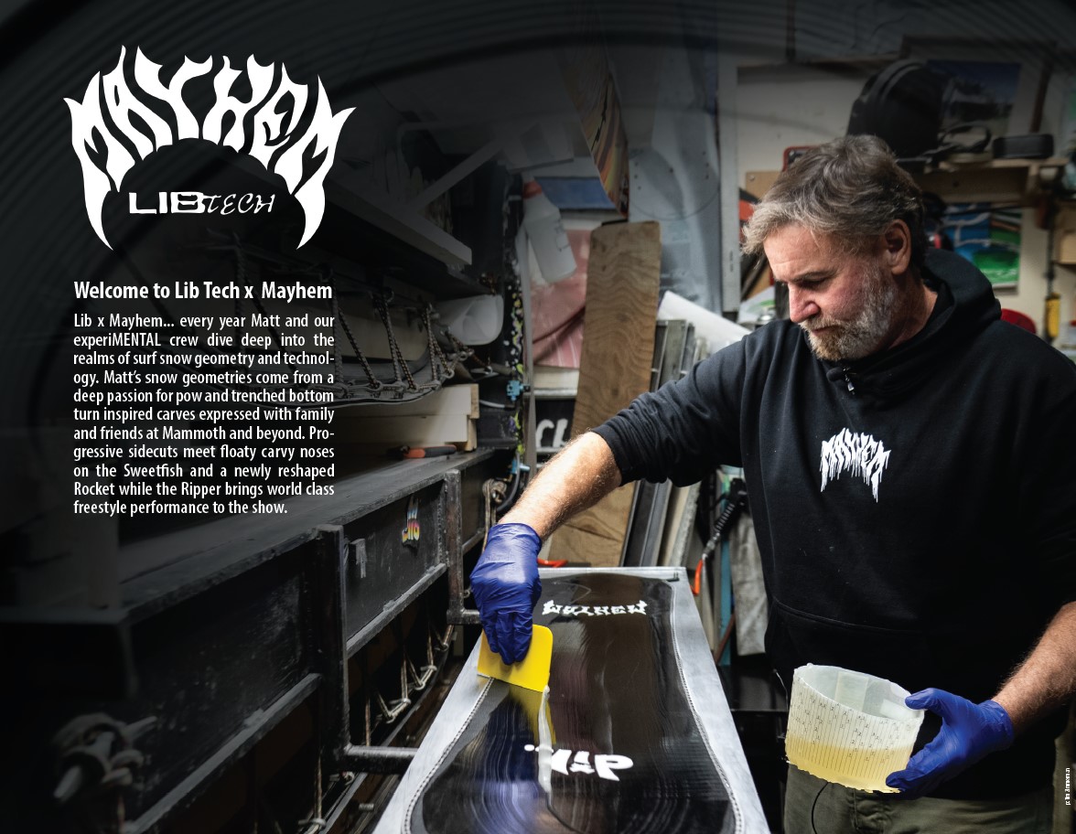 LIB TECH × MAYHEMが手掛けるハイパフォーマンス・ツインフリースタイルモデル。マンモスを拠点に活躍するライダーのフィードバックをもとに開発され、パークを主戦場にしながらも、ゲレンデ全体を遊び尽くせる懐の深さを持つ一本です。