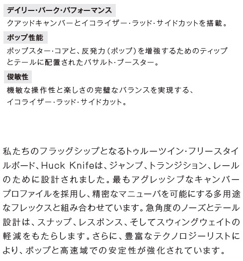 クラシックなシェイプをしたHUCK KNIFEは、パークで想像できるすべての動きを可能にしてくれます。